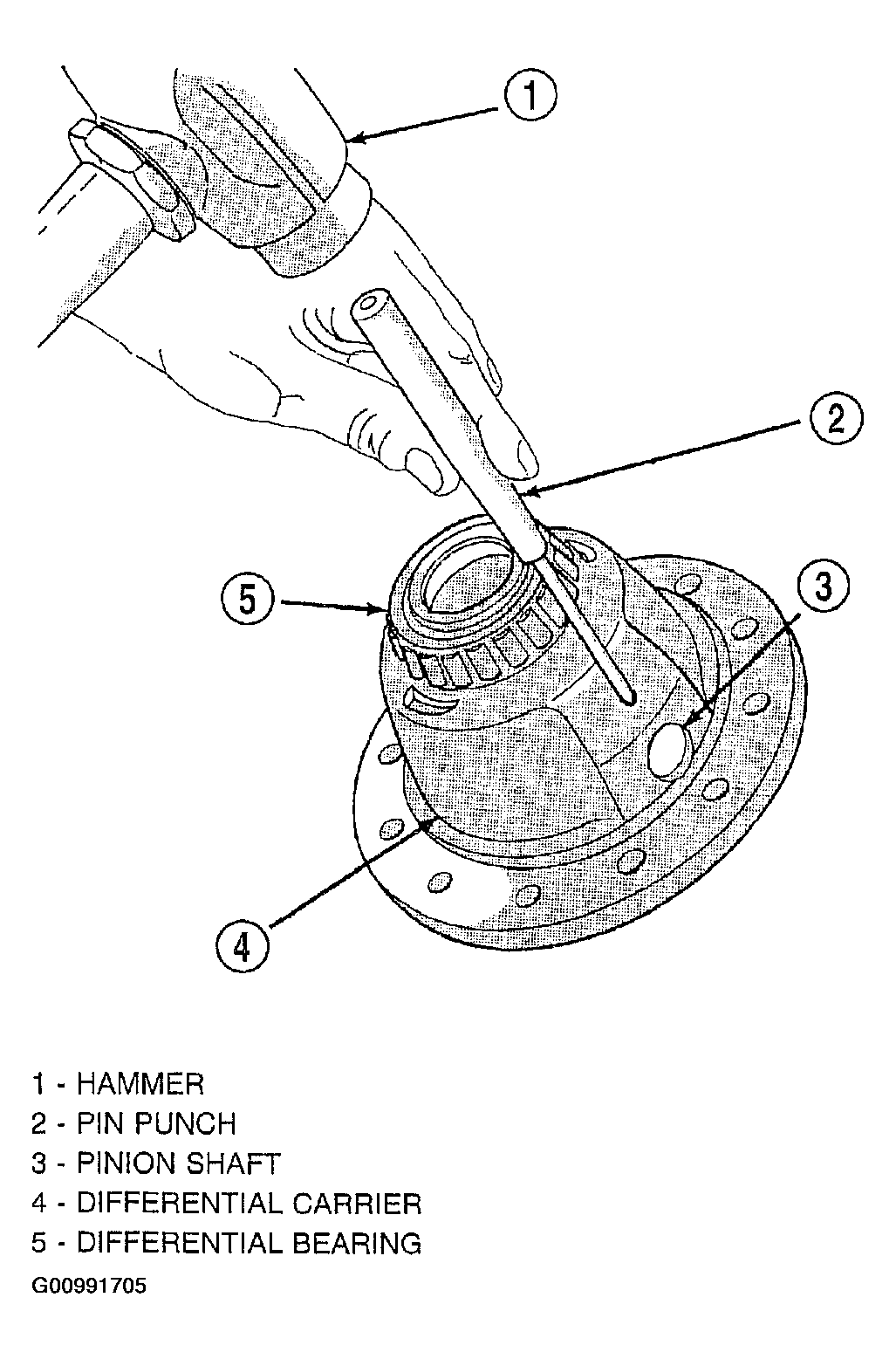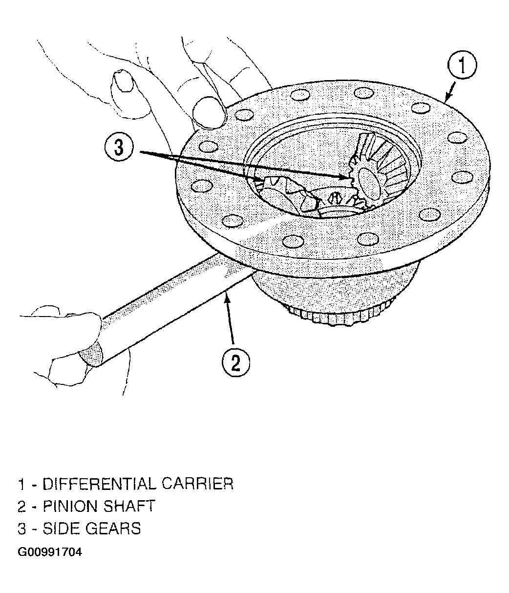 - Install differential pinion and side gears, and pinion shaft. See Fig 20.CAUTION: Use a new roll pin upon reassembly.