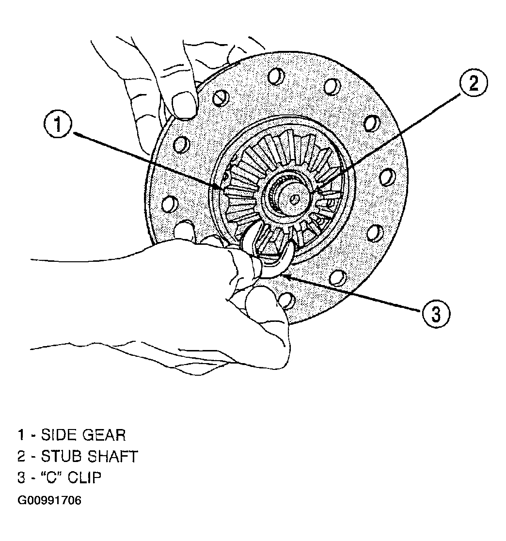 - Install side gear, stub shaft, and c-clip to differential support plate. See Fig 22.CAUTION: Ring gear bolts are not reusable. When reassembling, use new bolts.CAUTION: When assembling differential halves, line up notches on side of carrier.
