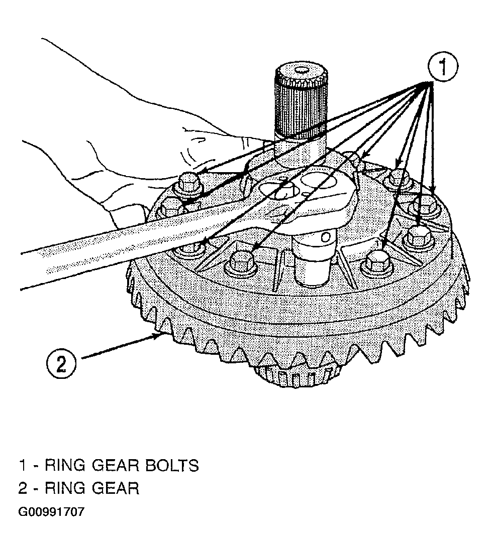 - Assemble support plate to differential. Install ring gear and NEW bolts. Torque bolts to 95 N.m (70 ft. lbs.). See Fig 23.