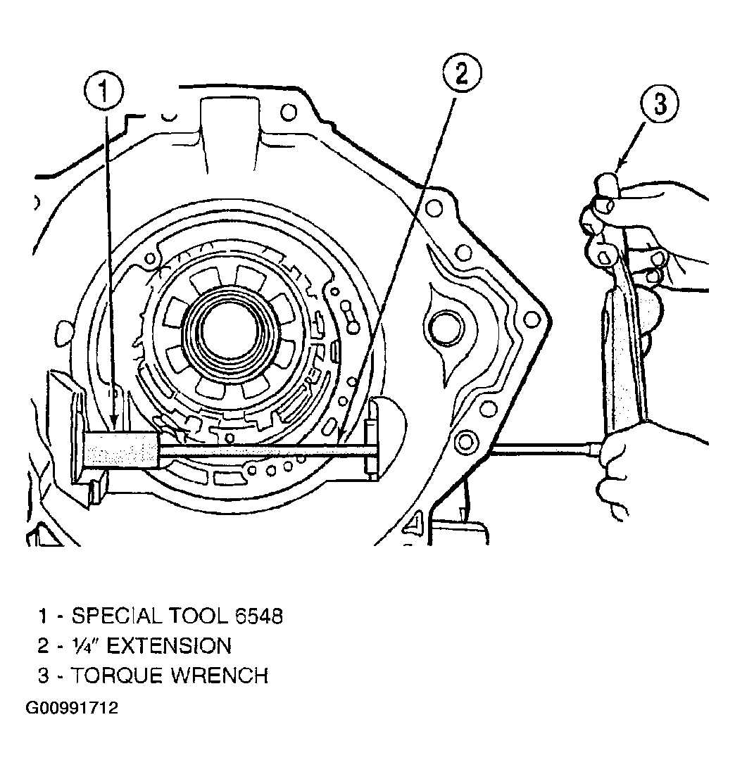 - Insert special tool 6548. See Fig 28. This tool will be used to check turning torque of the differential assembly.CAUTION: Differential bearings must be seated before taking turning torque readings. This is done by rotating the differential three or four turns in both directions.CAUTION: Turning torque of 19 to 23 in. lbs. can only be obtained when using new bearings. Do not attempt to obtain this turning torque with used bearings.