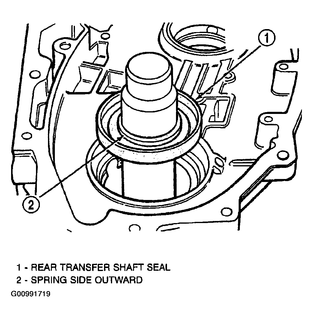 - Apply a small amount of lube to seal lips and install front transfer shaft seal. The serrated edges must face toward the rear of the transaxle. See Fig 33.
