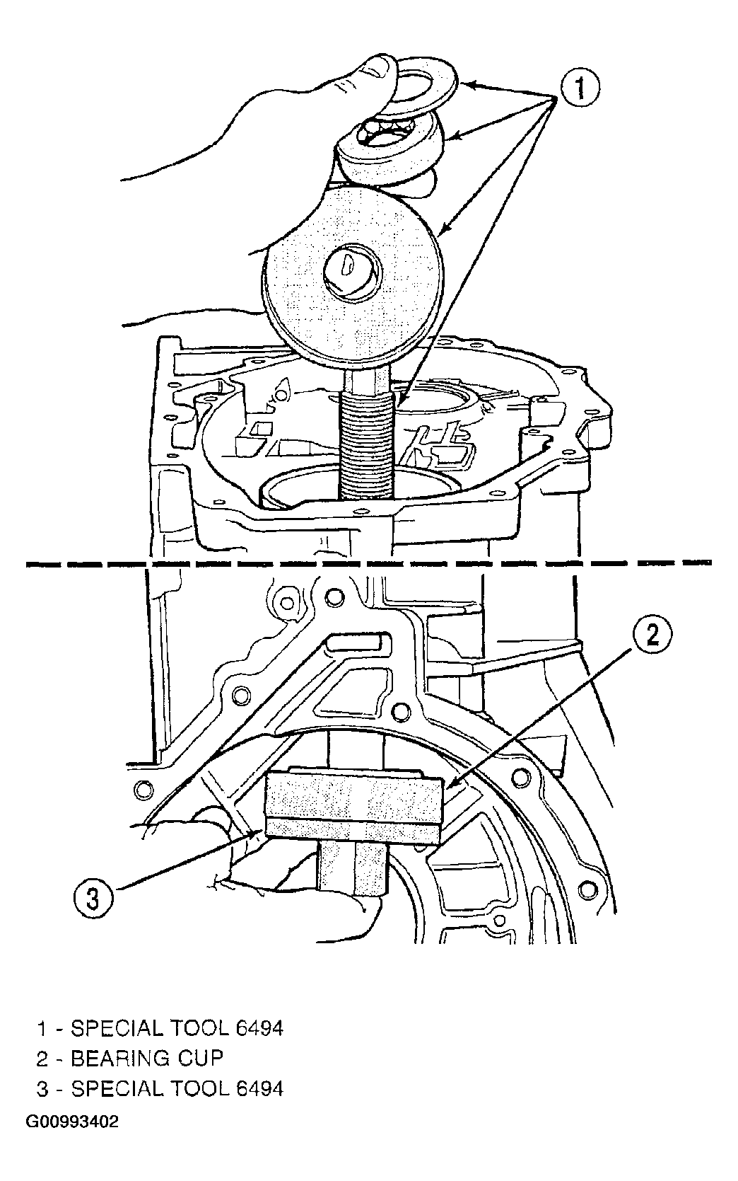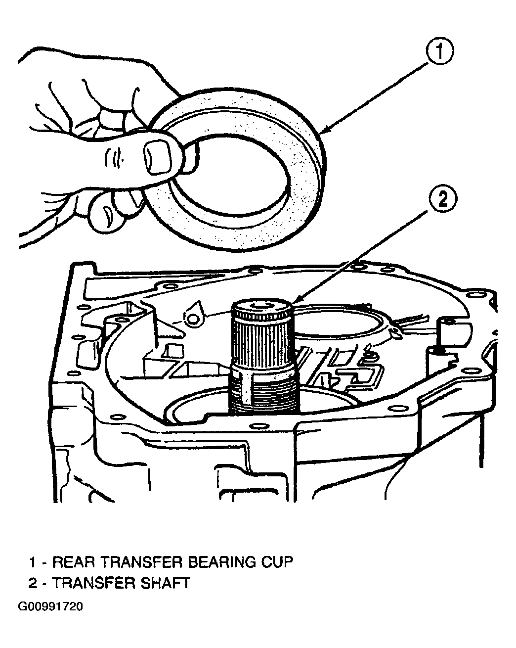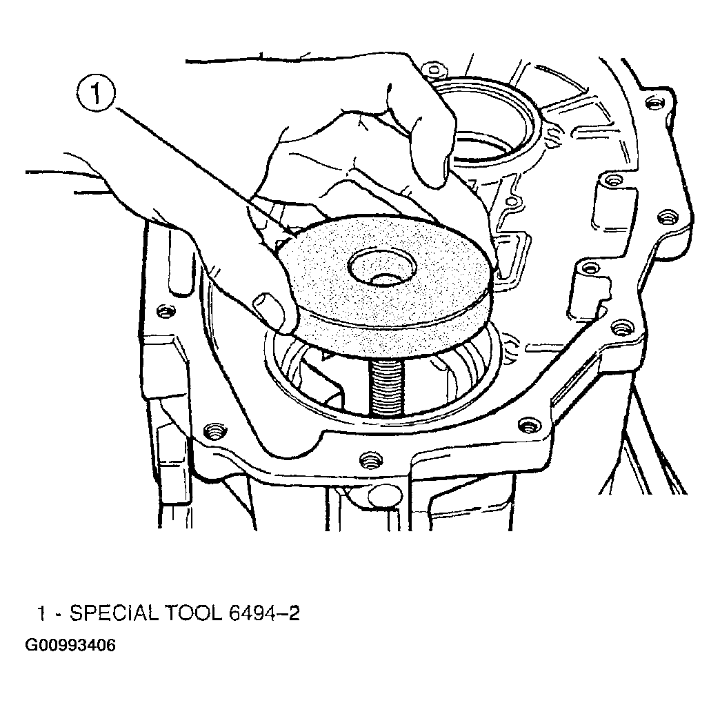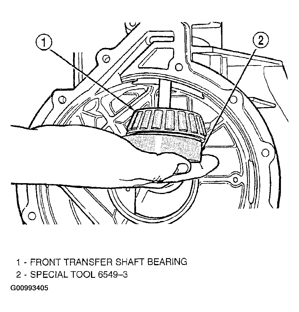 - Install front transfer shaft bearing cup. See Fig 1. The transfer shaft bearing cup must be installed before making pinion depth measurement. Use special tool 6494 to install bearing cup. There are no shims located behind this bearing cup.CAUTION: The bearing cup is seated in the case correctly if there is no clearance between the bottom of the bearing cup and case. If a 0.001" or 0.002" feeler gauge does not fit, the bearing cup is completely seated into transaxle case.