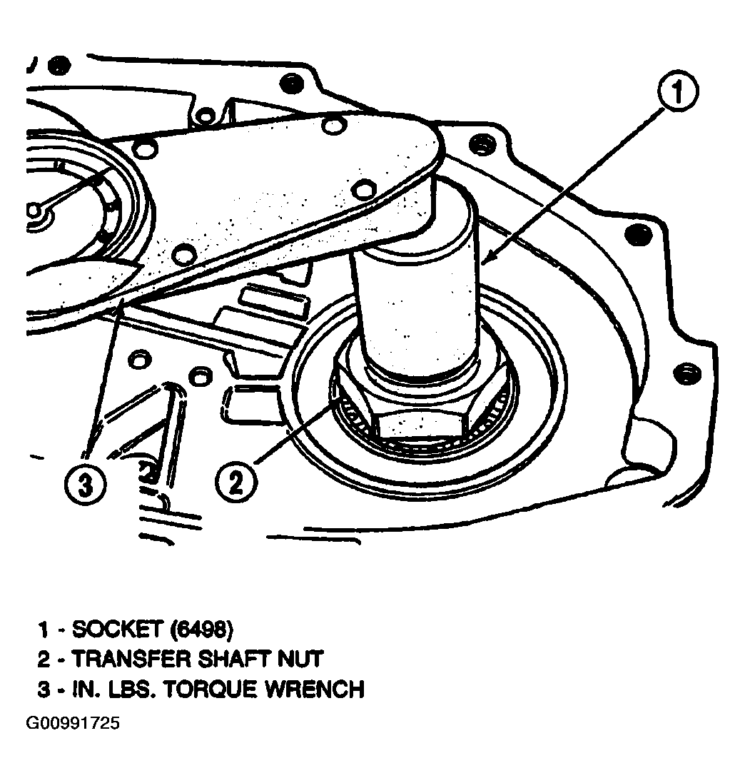 - Install a new transfer shaft nut. See Fig 40. Tighten nut to 271 N.m (200 ft. lbs.). Use special tools 6497 holder and 6498 shaft socket to tighten nut.