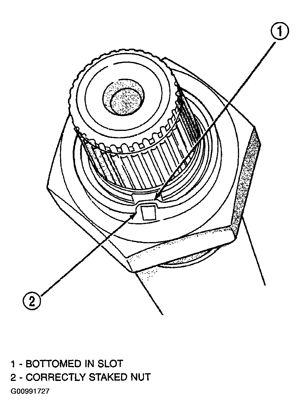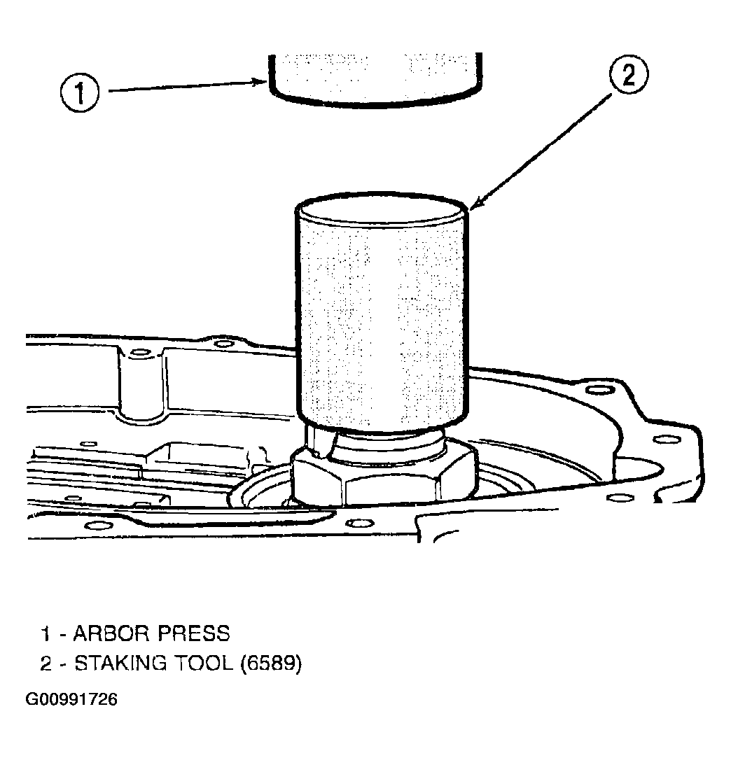 CAUTION: A press and special tool 6589 must be used when staking the transfer shaft nut. Do not use a hammer and the special tool to stake nut. If a hammer is used; seal, bearing, and/or tool damage may result. Also the stake will not be seated against the shaft correctly. This will allow the nut to loosen.
