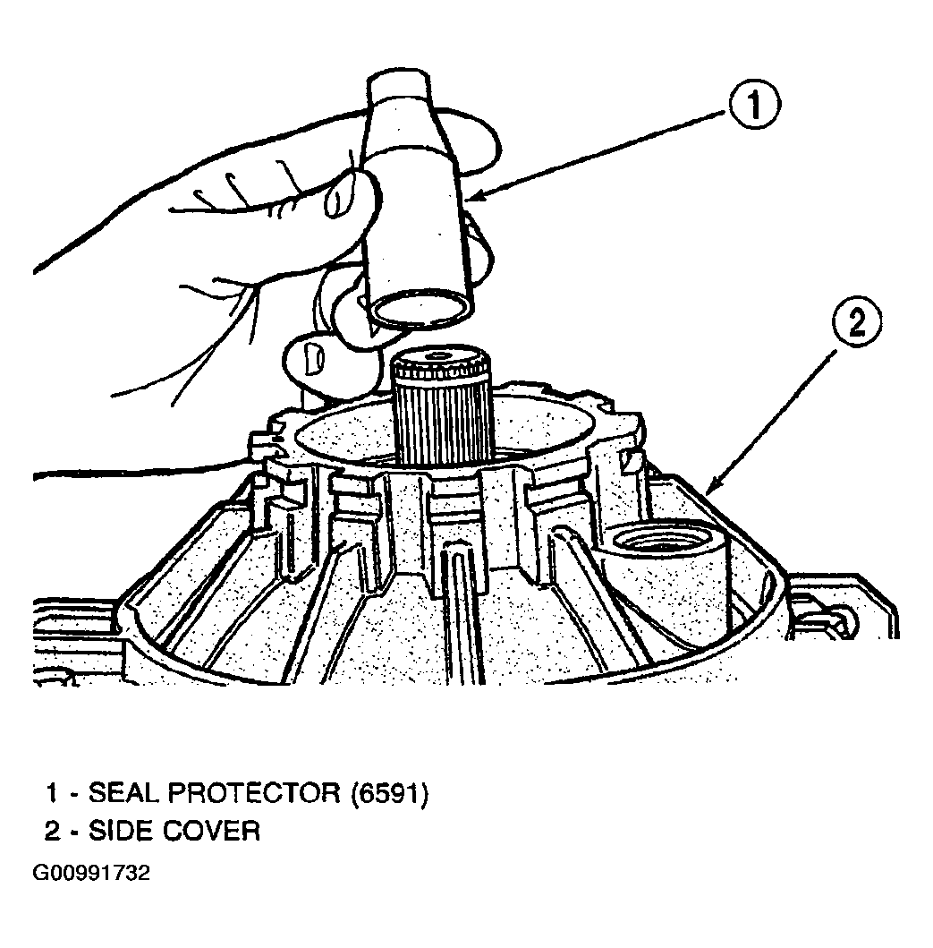 - Install seal protector (special tool 6591) as shown in Fig 26. Apply a thin film of gear oil on the protector.CAUTION: Lube threads and O-ring on adjuster before installing. Failure to due so will result in thread damage to the adjuster and transaxle case.