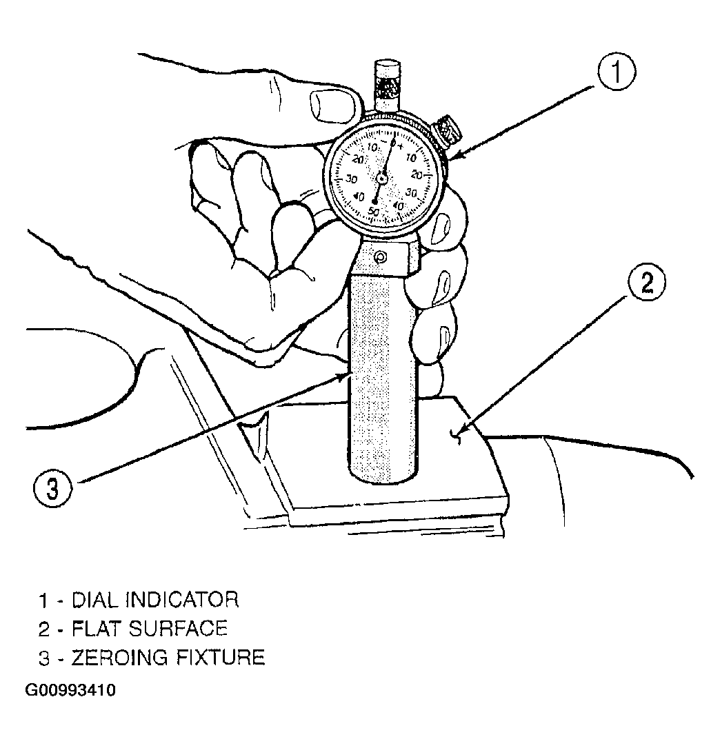 - Before making a pinion depth measurement the dial indicator must be zeroed. This is done by placing the dial indicator in the zeroing fixture (special tool 6549-6). Then place the zeroing fixture on a flat surface. Adjust the dial face so the pointer on the dial indicator lines up with the zero. See Fig 9.