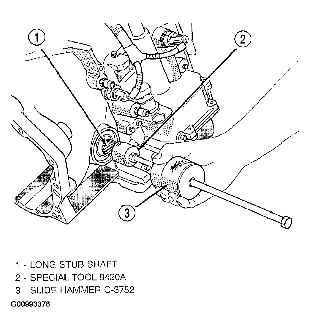 - Using slide hammer C-3752 and remover 8420A, remove long stub shaft from transaxle. See Fig 9.