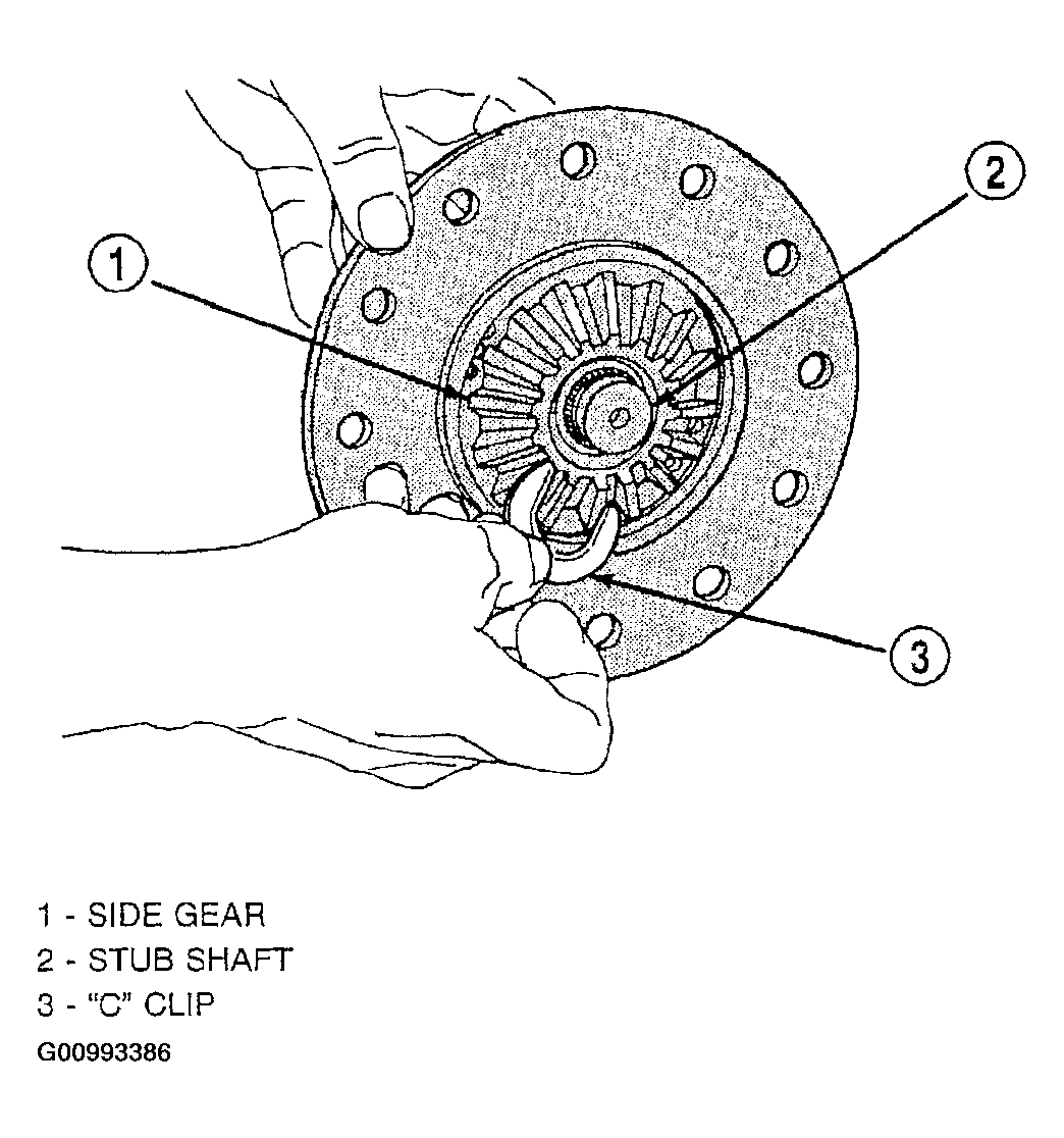 CAUTION: Driveshaft retainer clips and seals located on the stub shafts must be replaced before reinstalling halfshafts.