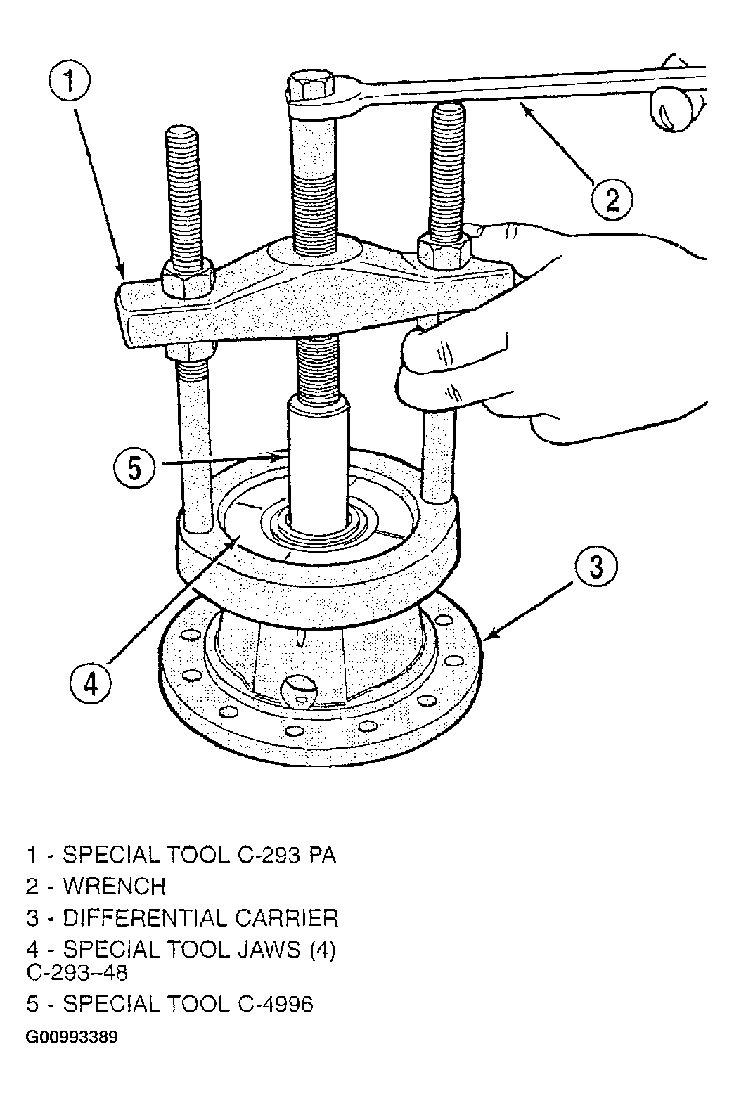 - Using tool C-293-PA, adapters C-293-48, and adapter C-4996, remove differential carrier bearings. See Fig 20.