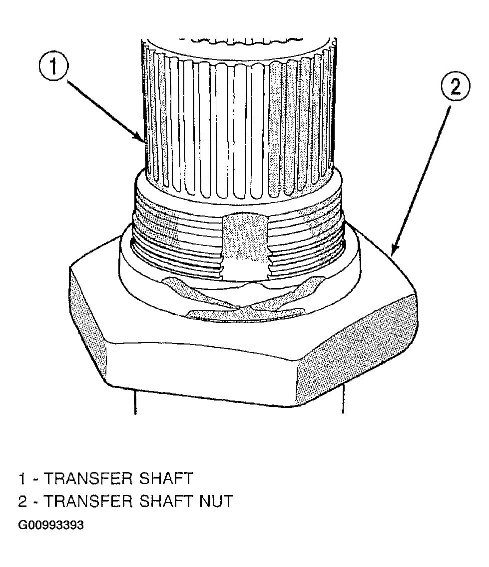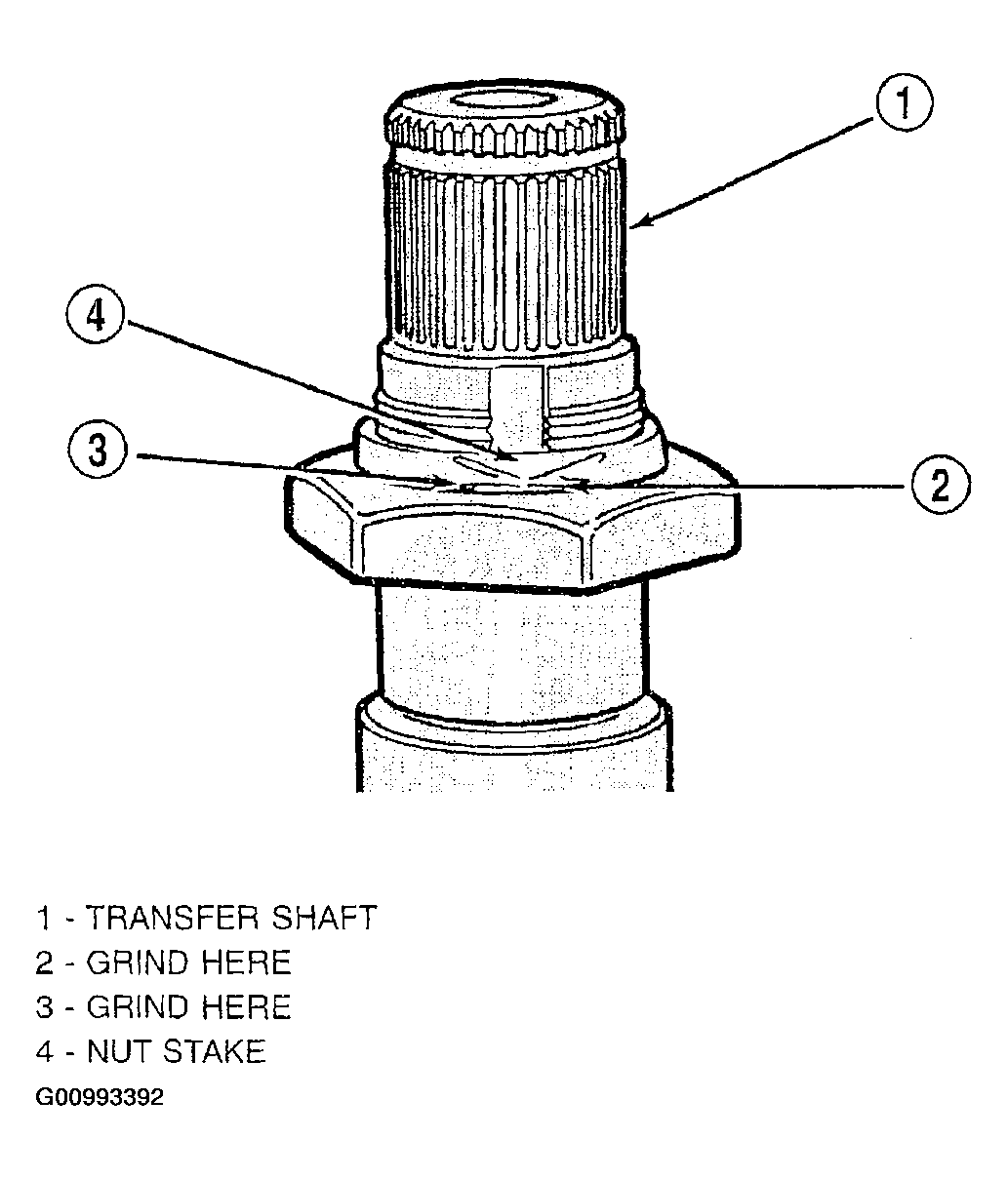 CAUTION: Failure to grind and open stakes on the transfer shaft nut will result in thread damage to transfer shaft during nut removal.WARNING: Wear safety goggles while grinding stake nuts.