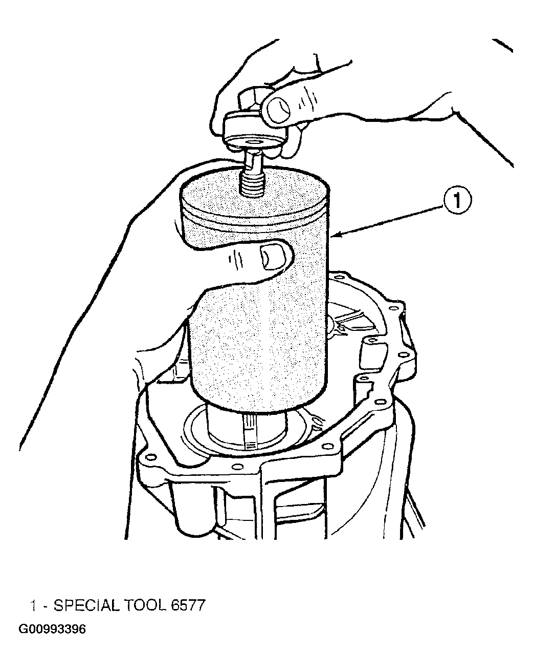 - Install special tool 6577 to remove rear transfer bearing cup. See Fig 27.