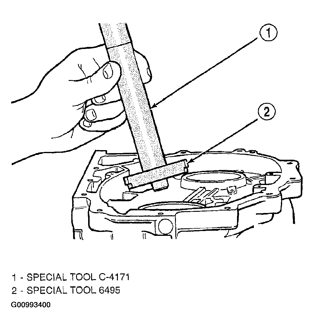 - Remove the front transfer shaft bearing cup using special tool 6495 and handle C-4171. See Fig 31. Use a press with special tools to remove cup.