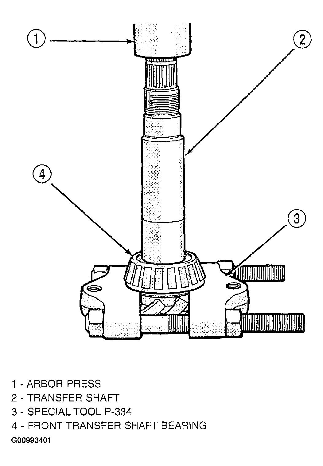 - Support special tool P-334 on press table so that pinion head of transfer shaft can be pressed through table. See Fig 32.