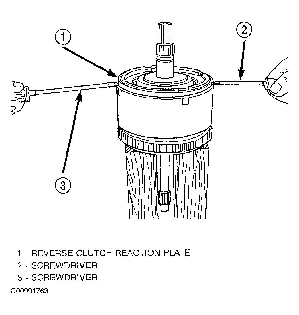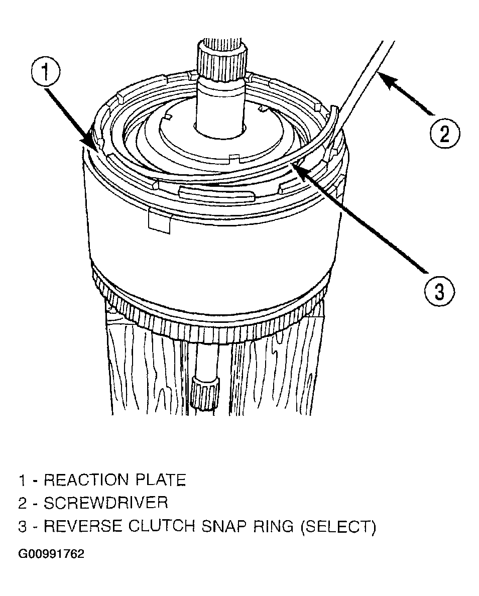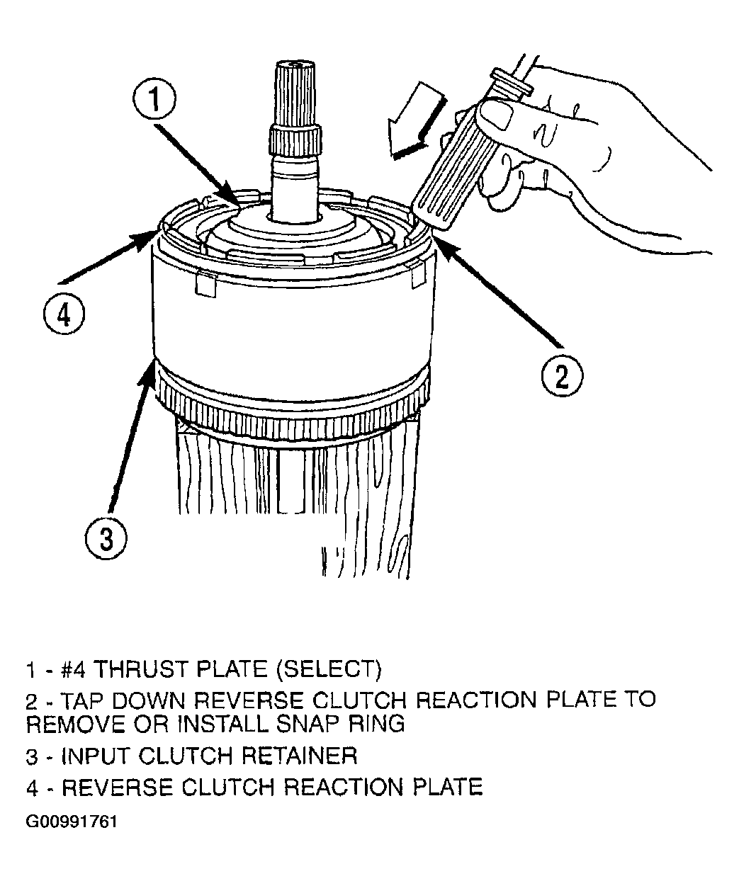 - Tap down reverse clutch reaction plate to release pressure from snap ring. See Fig 1.