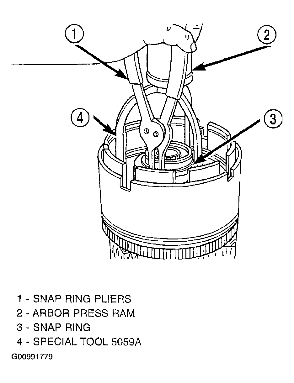 - Using Tool 5059A and an arbor press, compress UD clutch piston enough to remove snap ring. See Fig 19 and Fig 20