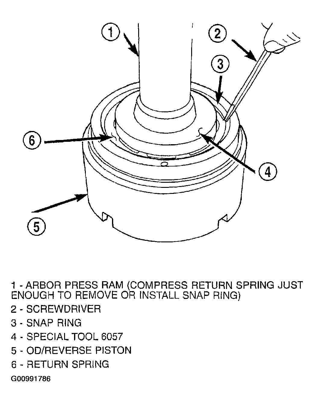 - Using Tool 6057 and an arbor press, compress return OD/Reverse piston return spring just enough to remove snap ring. See Fig 26 and Fig 27