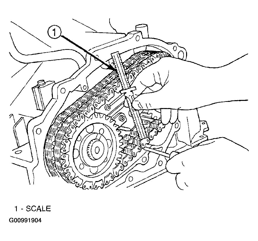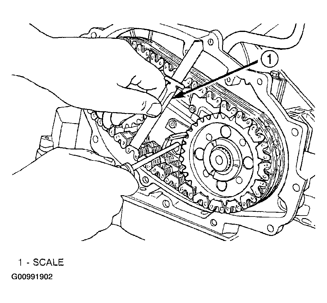 - Measure the distance between the two marks placed on the scale. See Fig 5. If the two marks on the scale are more than one inch apart, replace the drive chains.