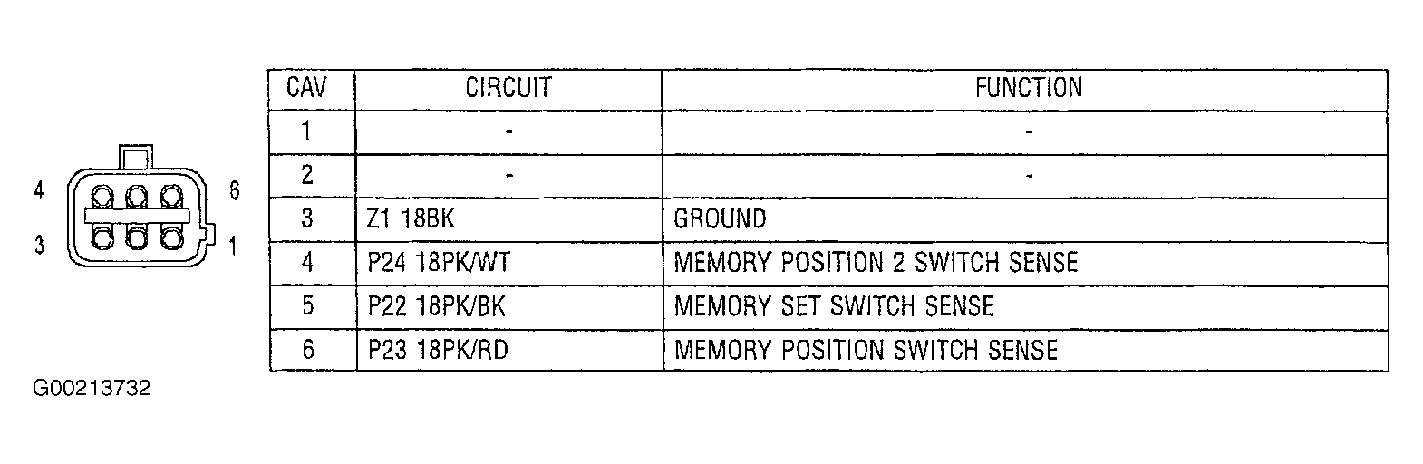 - Turn ignition off. Disconnect Memory Heated Seat/Mirror Module (MHSMM) connector C1. Measure resistance between ground and memory set switch connector terminal No. 6, memory position 1 switch sense circuit (Pink/Red wire). See Figure . If resistance is less than 100 ohms, repair short to ground in Pink/Red wire. If resistance is 100 ohms or more, replace MHSMM. See MEMORY HEATED SEAT/MIRROR MODULE under REMOVAL & INSTALLATION.