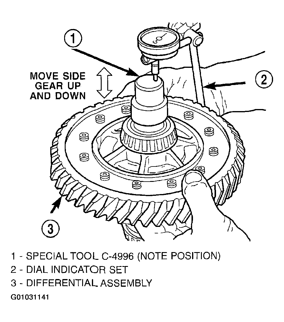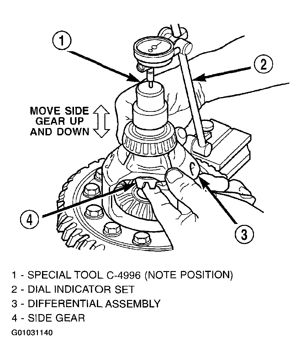 - Set up dial indicator set C-3339 and tool C-4996 as shown in to measure side gear end play. (Fig 5 and Fig 6 ). Side gear end play must be within 0.001-0.013 in. .