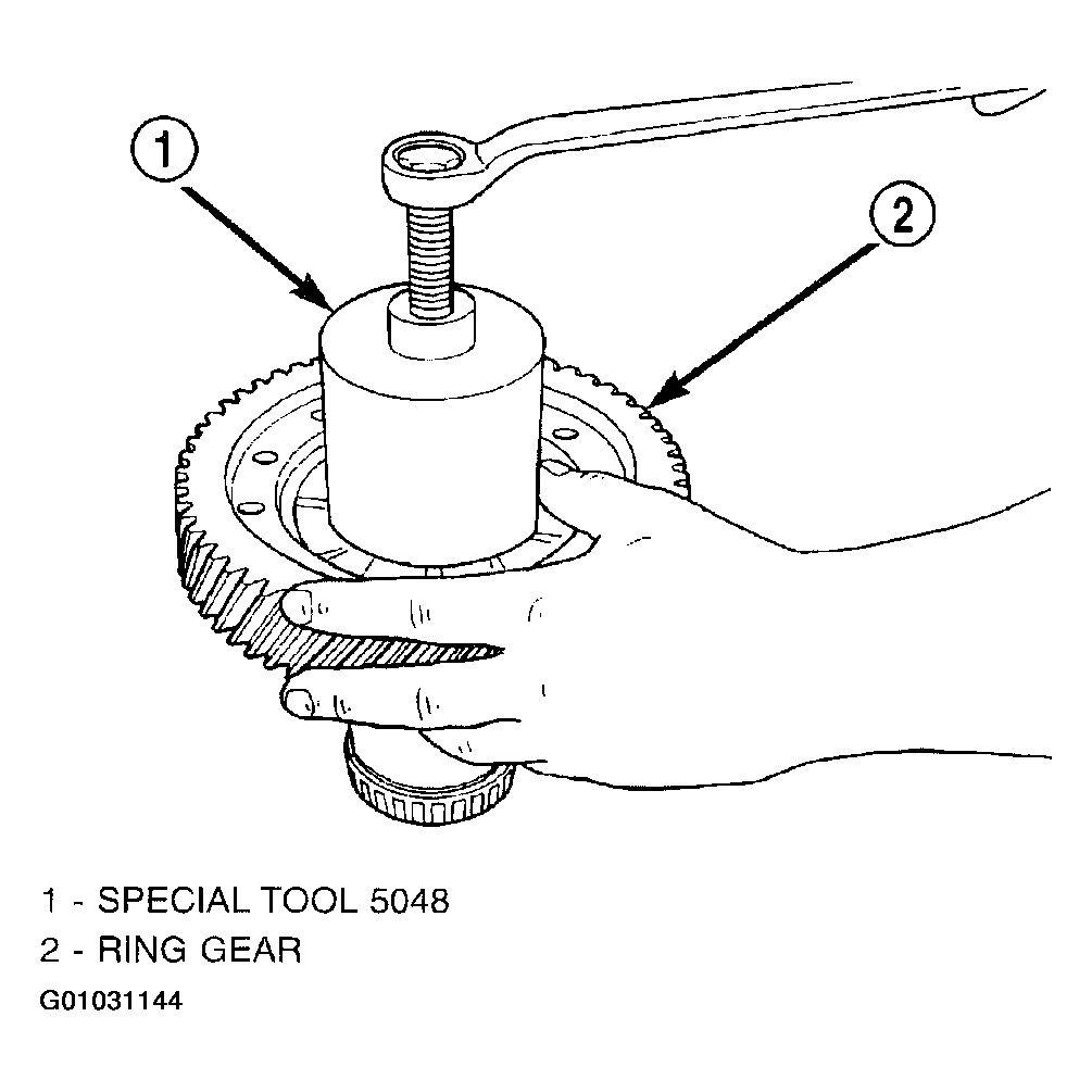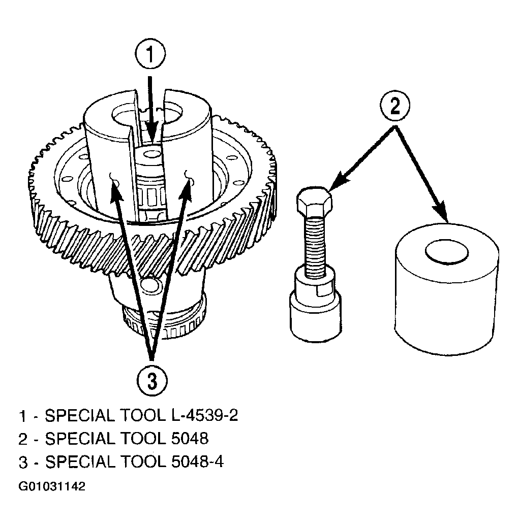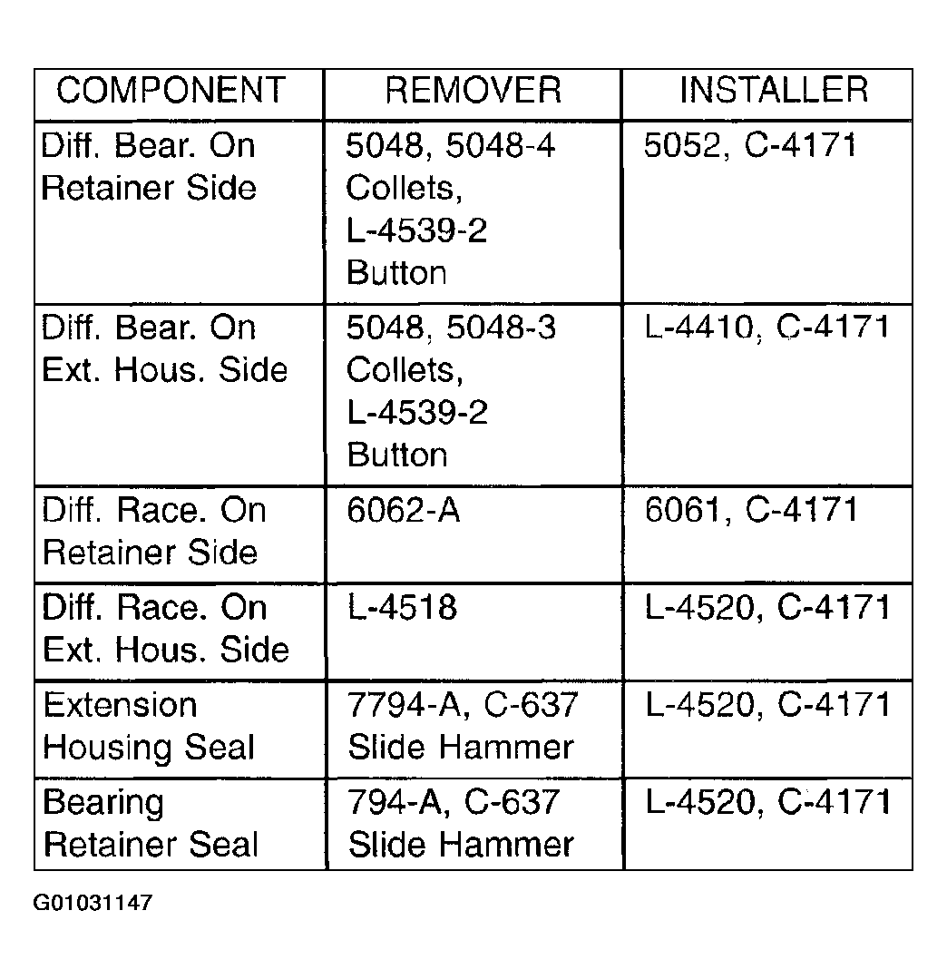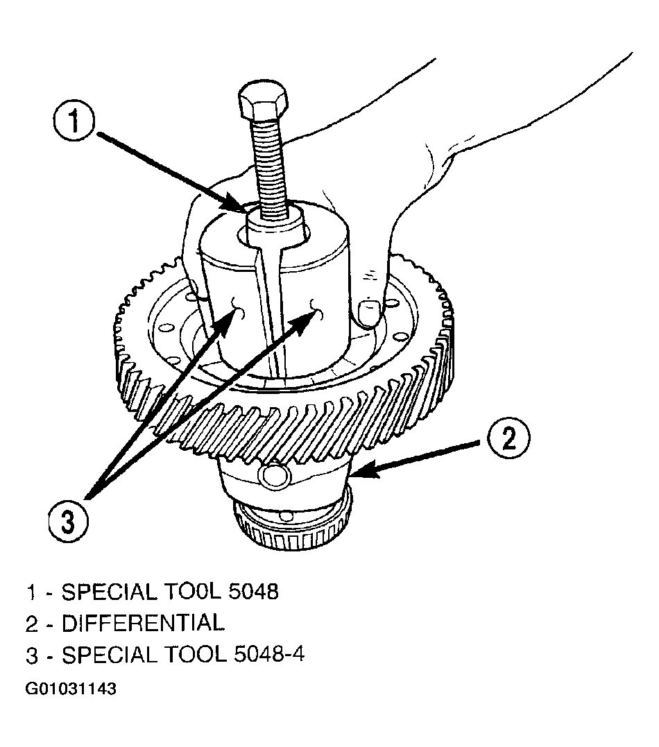 - Use Miller Special Tool 5048, 5048-3 Collets, and L-4539-2 Button to remove the differential bearing cone on the extension housing side.