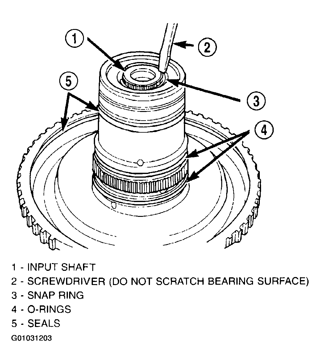 NOTE: Snap ring ends must be located within one finger of the input clutch hub. Be sure that snap ring is fully seated, by pushing with screwdriver, into snap ring groove all the way around.