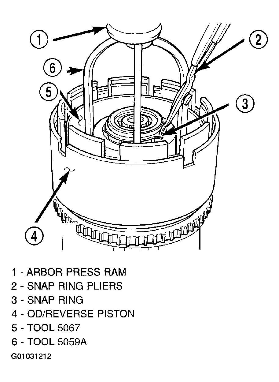 - Using an arbor press and Tool 6057, install OD/Reverse piston return spring and snap ring. (Fig 3 and Fig 4 ).