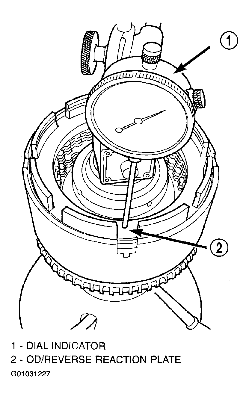 - Zero dial indicator and apply 30 psi (206 kPa) air pressure to the overdrive clutch hose on Tool 8391. Measure and record OD clutch pack measurement in four (4) places, 90° apart.