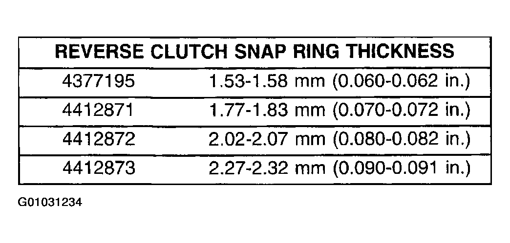 - Take average of four measurements and compare with reverse clutch pack clearance specification. The reverse clutch pack clearance is 0.89-1.37 mm (0.035-0.054 in.). Select the proper reverse clutch snap ring to achieve specifications: (Fig 33).