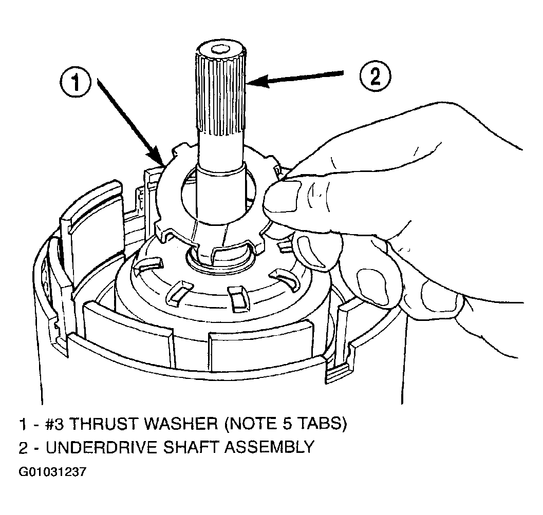 - Install the #3 thrust washer to the underdrive shaft assembly. Be sure five tabs are seated properly. (Fig 36).