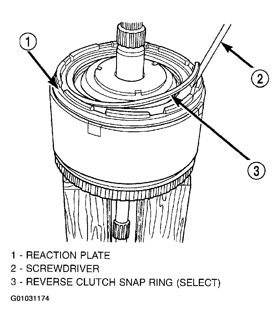 - Tap down reverse clutch reaction plate to release pressure from snap ring. (Fig 1).