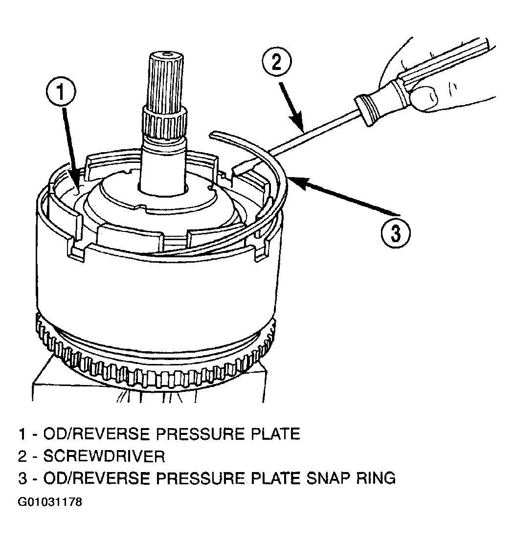 - Remove the OD/Reverse pressure plate snap ring. (Fig 6).