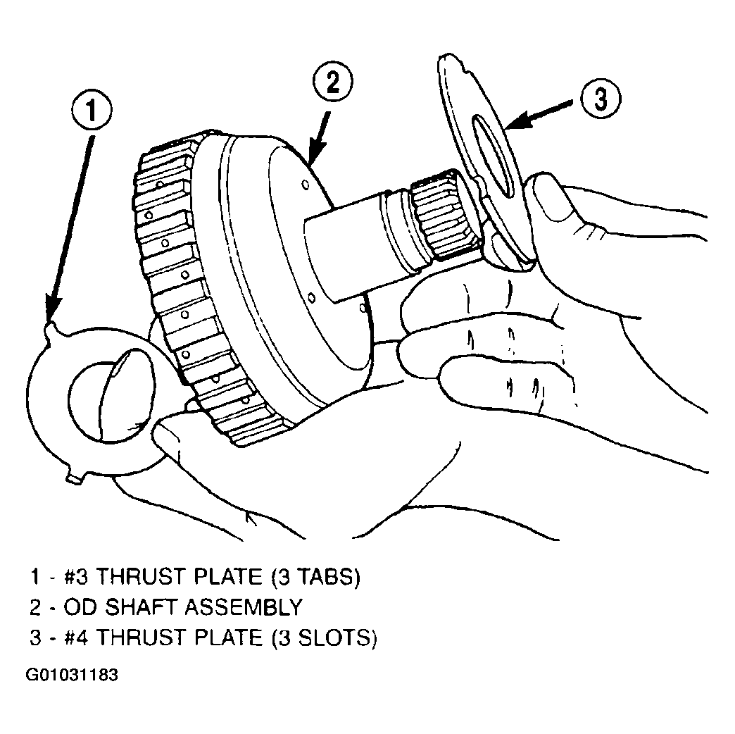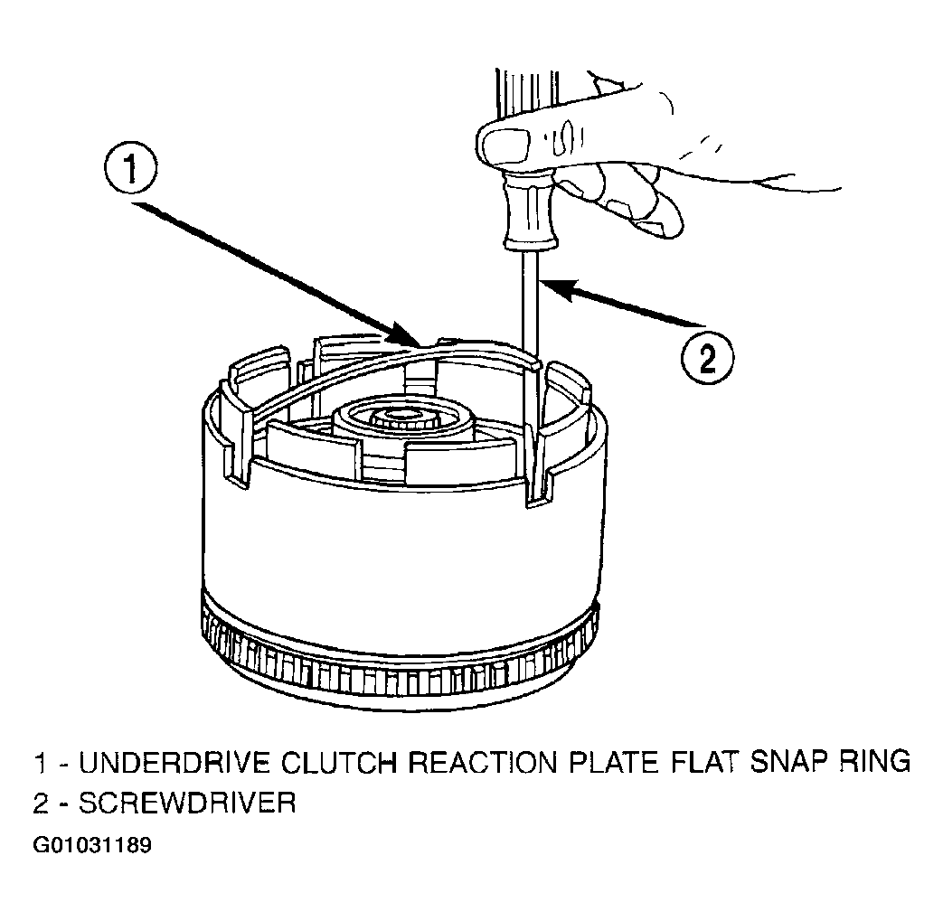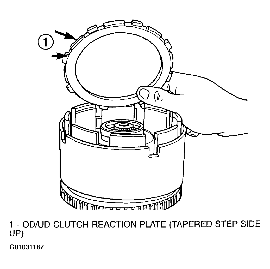 The OD/UD clutch reaction plate has a step on both sides. Install the OD/UD clutches reaction plate tapered step side up.