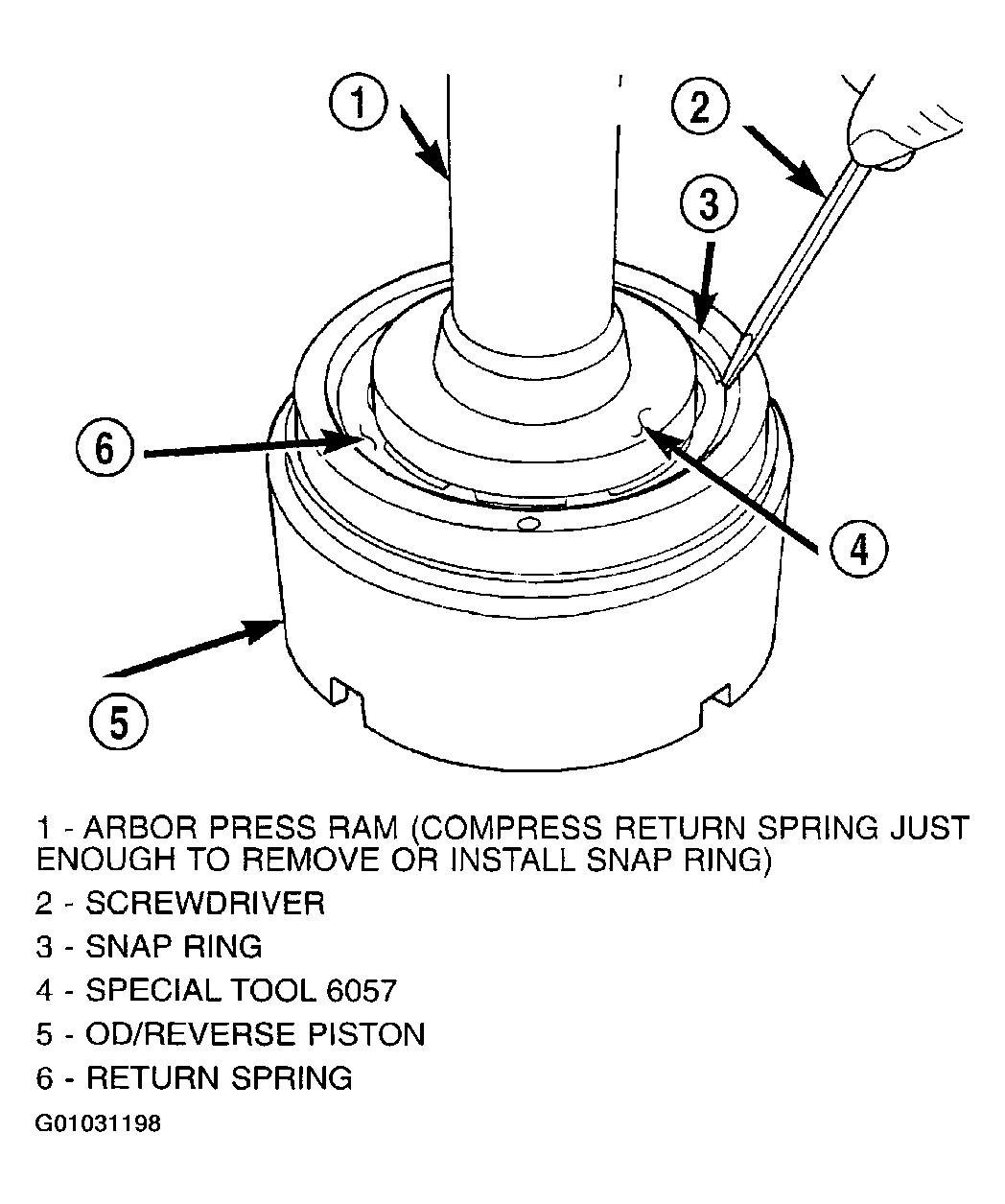 - Using Tool 6057 and an arbor press, compress return OD/Reverse piston return spring just enough to remove snap ring. (Fig 26 and Fig 27