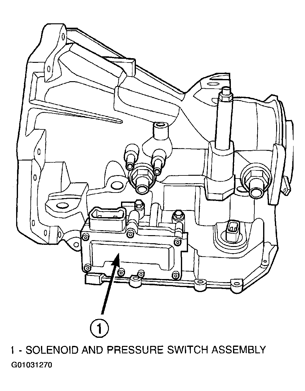 The Solenoid/Pressure Switch Assembly is external to the transaxle and mounted to the transaxle case. (Fig 1). The assembly consists of four solenoids that control hydraulic pressure to the LR/CC, 2/4, OD, and UD friction elements. The reverse clutch is controlled by line pressure from the manual valve in the valve body. The solenoids are contained within the Solenoid/Pressure Switch Assembly, and can only be serviced by replacing the assembly.