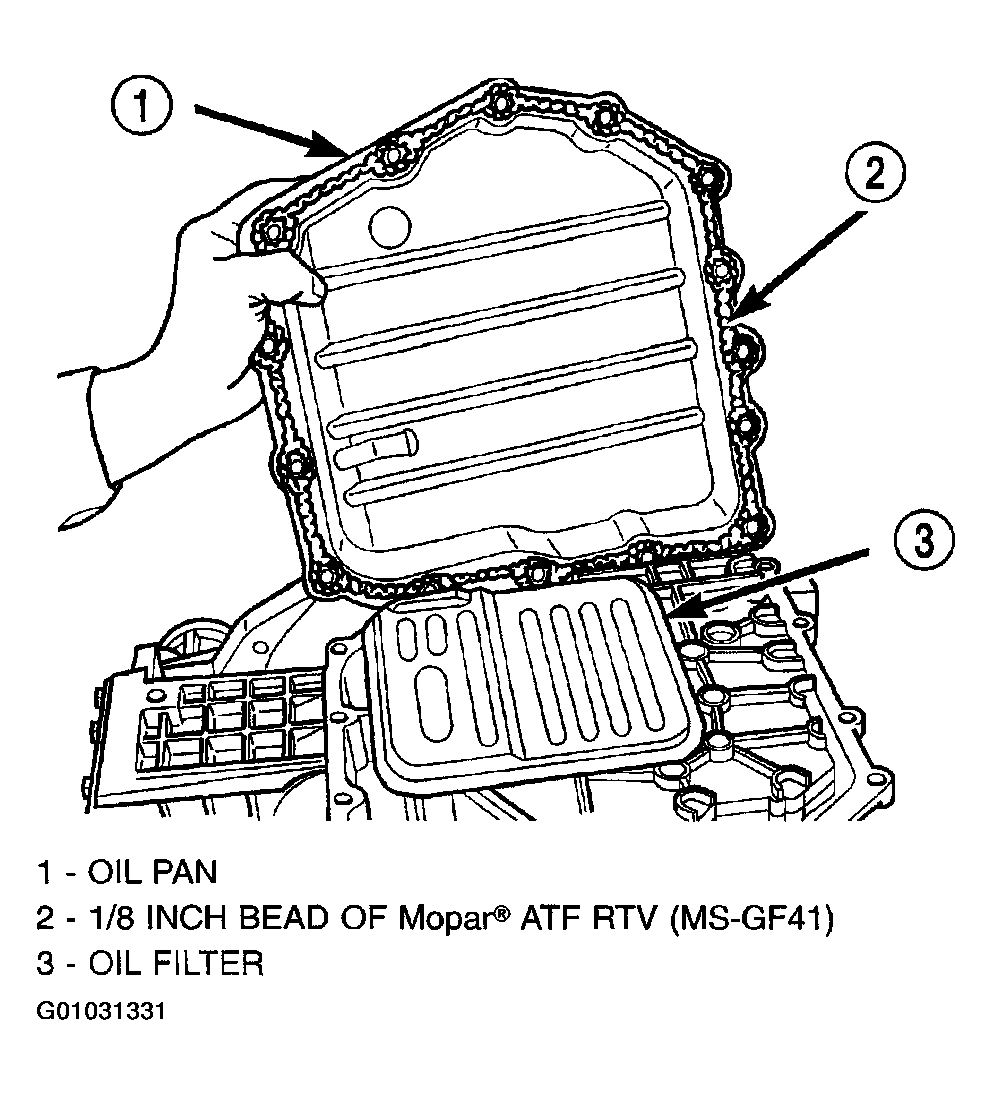 - Ensure the transaxle oil pan and transaxle case sealing surfaces are clean and dry. Install an 1/8" bead of Mopar® ATF RTV (MS-GF41) to the oil pan and install. (Fig 4). Torque oil pan-to-transaxle case bolts to 19 N.m (165 in. lbs.). (Fig 5).