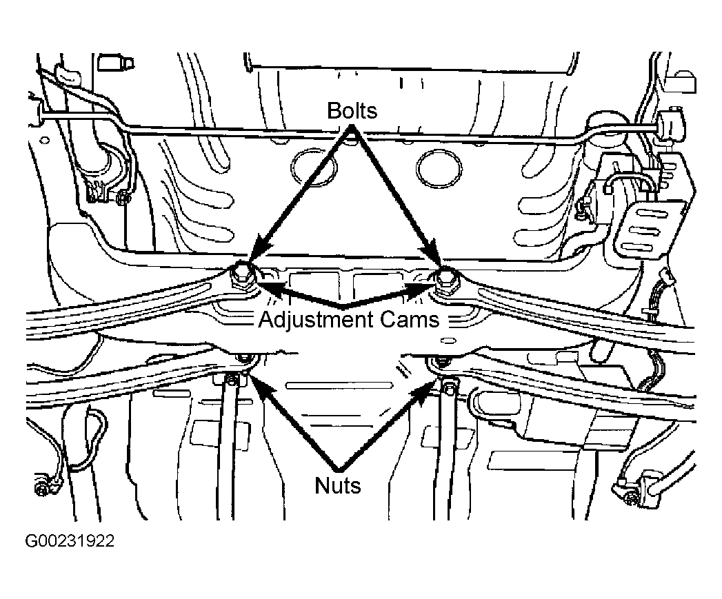 With steering wheel centered and locked, loosen rear lateral link nuts at crossmember. Rotate adjustment cams to set to specification. See Fig 1. See WHEEL ALIGNMENT SPECIFICATIONS . Ensure notches on lateral link adjustment cams are facing upward. Tighten nuts to specification. See TORQUE SPECIFICATIONS .