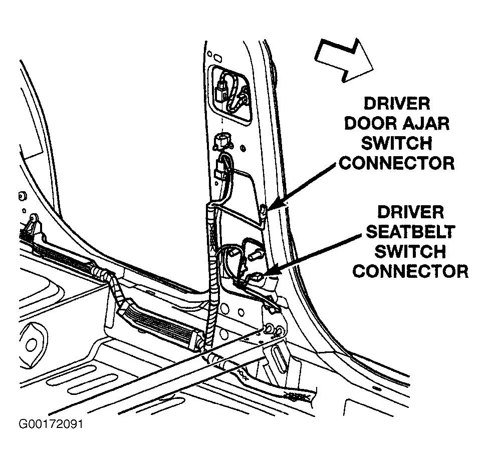 - Turn the ignition off. Disconnect the seat belt switch harness connector. See Fig 1. Measure the resistance between ground and the seat belt switch ground circuit. If the resistance is below 5.0 ohms, go to the next step. If the resistance is above 5.0 ohms, repair the seat belt switch ground circuit for an open.