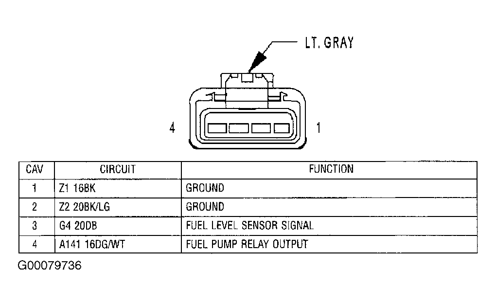 - Turn ignition off. Connect a test light between battery positive terminal and ground circuit (Black wire) at fuel pump module harness connector. If test light illuminates brightly, go to next step. If test light does not illuminate brightly, repair open in ground circuit. See WIRING DIAGRAMS article.