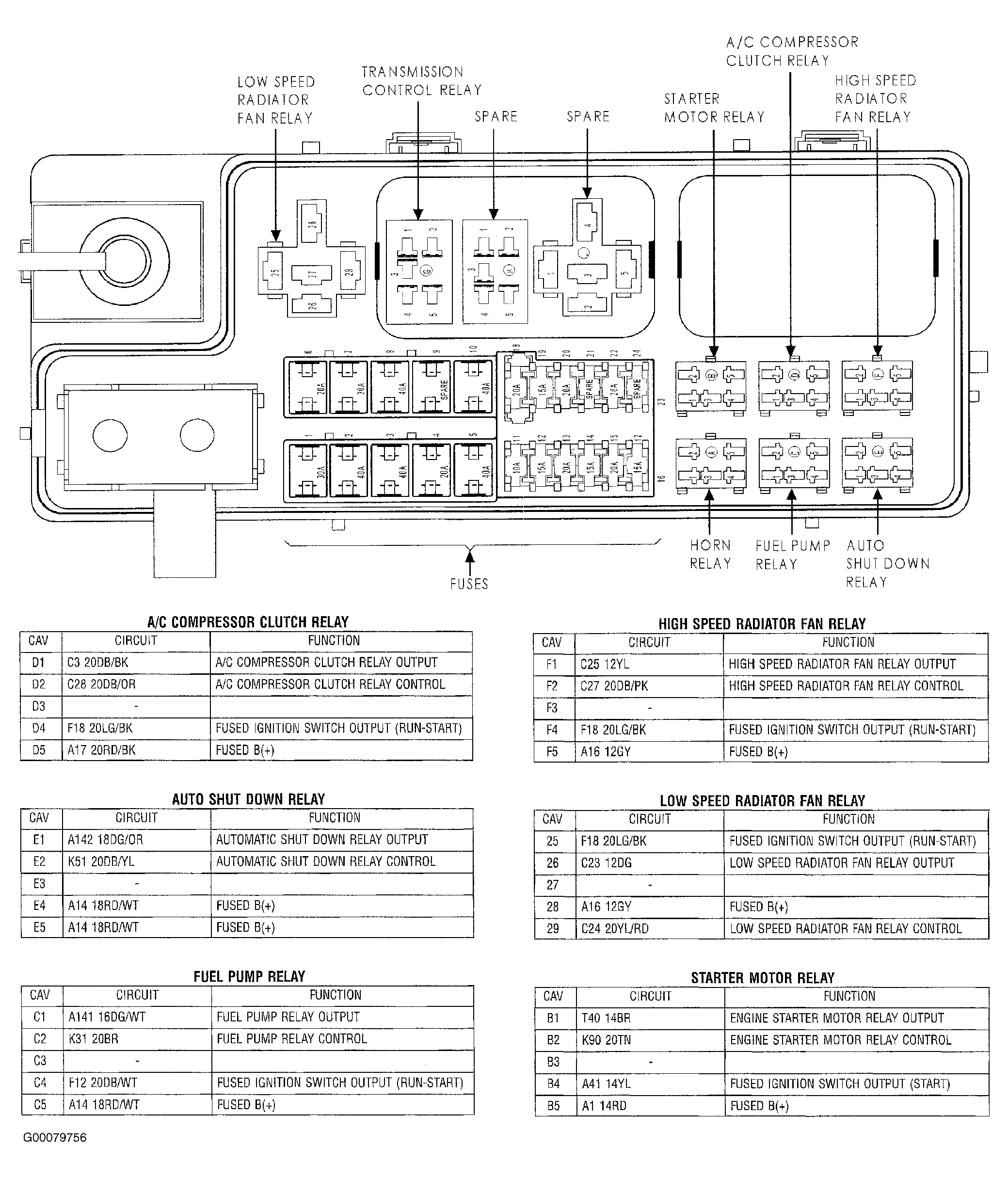 - Turn ignition off. Remove fuel pump relay from PDC. See Figure . PDC is located in engine compartment. See Figure . Connect a test light between ground and fused battery voltage circuit (Red/White wire) at terminal C5 at fuel pump relay harness connector in PDC. If test light illuminates, go to next step. If test light does not illuminate, repair open in fused battery voltage circuit.