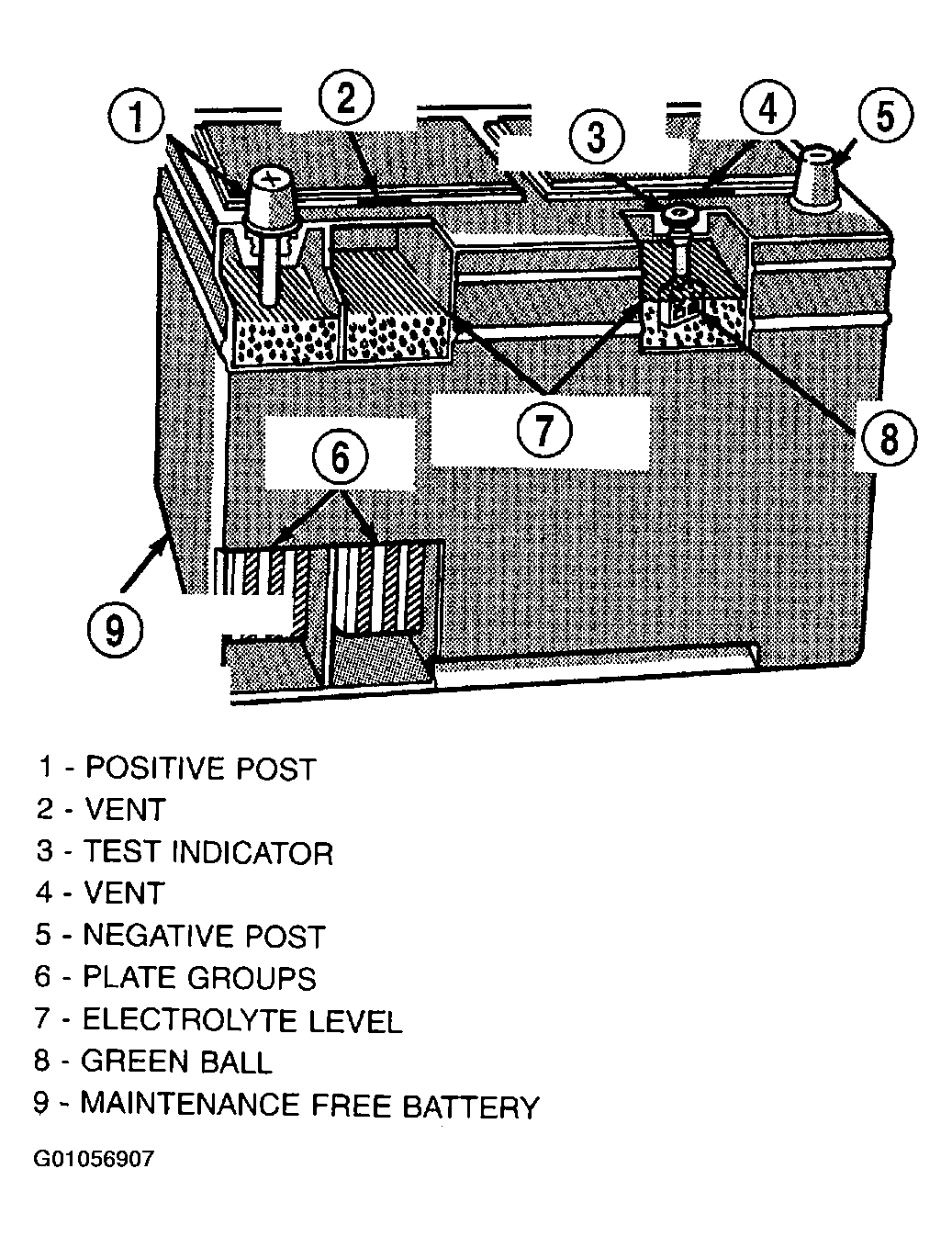 Maintenance-free batteries have non-removable battery vent caps (Fig. Fig 1). Water cannot be added to this battery. Under normal service the composition of this battery reduces gassing and water loss at normal charge rates. If the battery electrolyte level becomes low, this battery must be replaced.