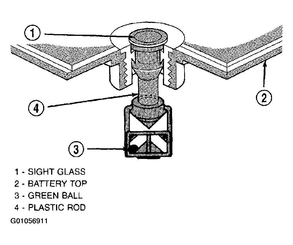 An indicator (hydrometer) built into the top of the battery case provides visual information for battery testing (Fig. Fig 1). Like a hydrometer, the built-in indicator measures the specific gravity of the battery electrolyte. The specific gravity of the electrolyte reveals the battery state-of-charge; however, it will not reveal the cranking capacity of the battery. A load test must be performed to determine the battery cranking capacity. Refer to Standard Procedures for the proper battery load test procedures.