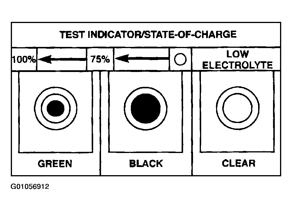 Indicates 75% to 100% battery state-of charge. The battery is adequately charged for further testing or return to service. If the starter will not crank for a minimum of fifteen seconds with a fully charged battery, the battery must be load tested. Refer to Standard Procedures for the proper battery load test procedures. - Black or Dark