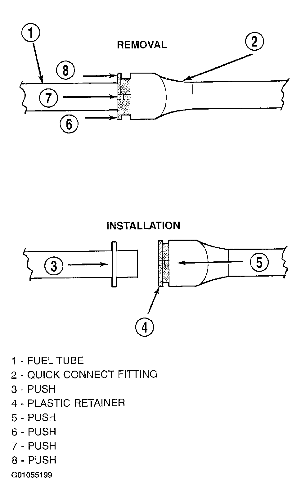 - To release fuel system component from quick-connect fitting, firmly push fitting towards component being serviced while firmly pushing plastic retainer ring into fitting (Figure). With plastic ring depressed, pull fitting from component. The plastic retainer ring must be pressed squarely into fitting body. If this retainer is cocked during removal, it may be difficult to disconnect fitting. Use an open-end wrench on shoulder of plastic retainer ring to aid in disconnection.