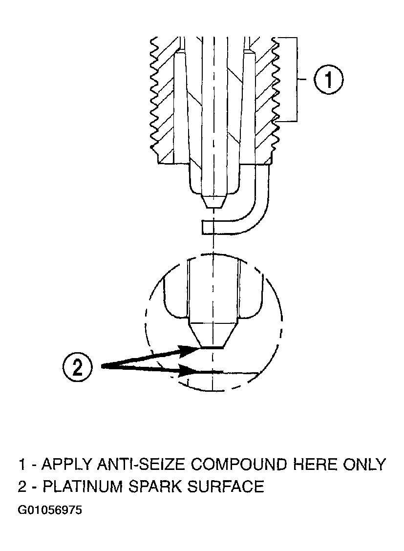 When the spark plugs use a single or double platinum tips and they have a recommended service life of 100,000 miles for normal driving conditions per schedule A in this manual. The spark plugs have a recommended service life of 75,000 miles for severe driving conditions per schedule B in this manual. A thin platinum pad is welded to both or center electrode end(s) as show in (Fig 1 ). Extreme care must be used to prevent spark plug cross threading, misgaping (Fig 2 ) and ceramic insulator damage during plug removal and installation.