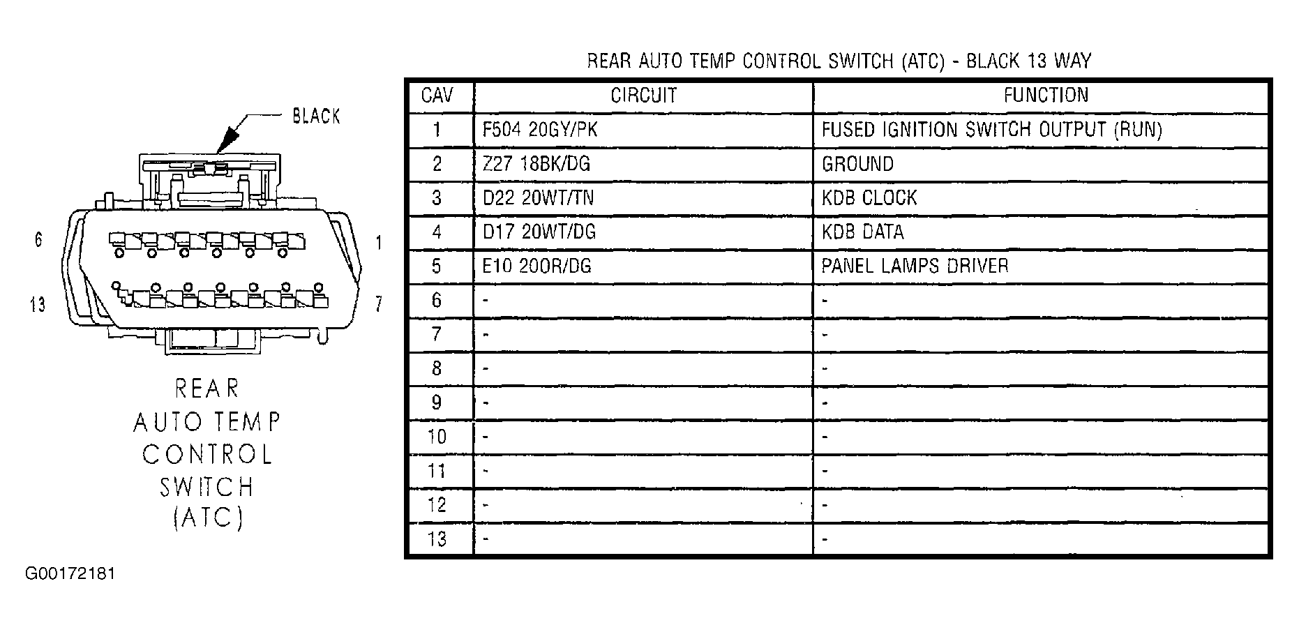 - Turn ignition switch to OFF position. Disconnect rear zone control panel harness connector. Using DVOM measure resistance between ground and rear zone control panel connector terminal No. 2 (Black/Dark Green wire). If reading is less than 5 ohms, go to next step. If reading is 5 ohms or more, locate and repair open between ground and Black/Dark Green wire. After repair, calibrate ATC module. See HVAC CONTROL CALIBRATION under PROGRAMMING.