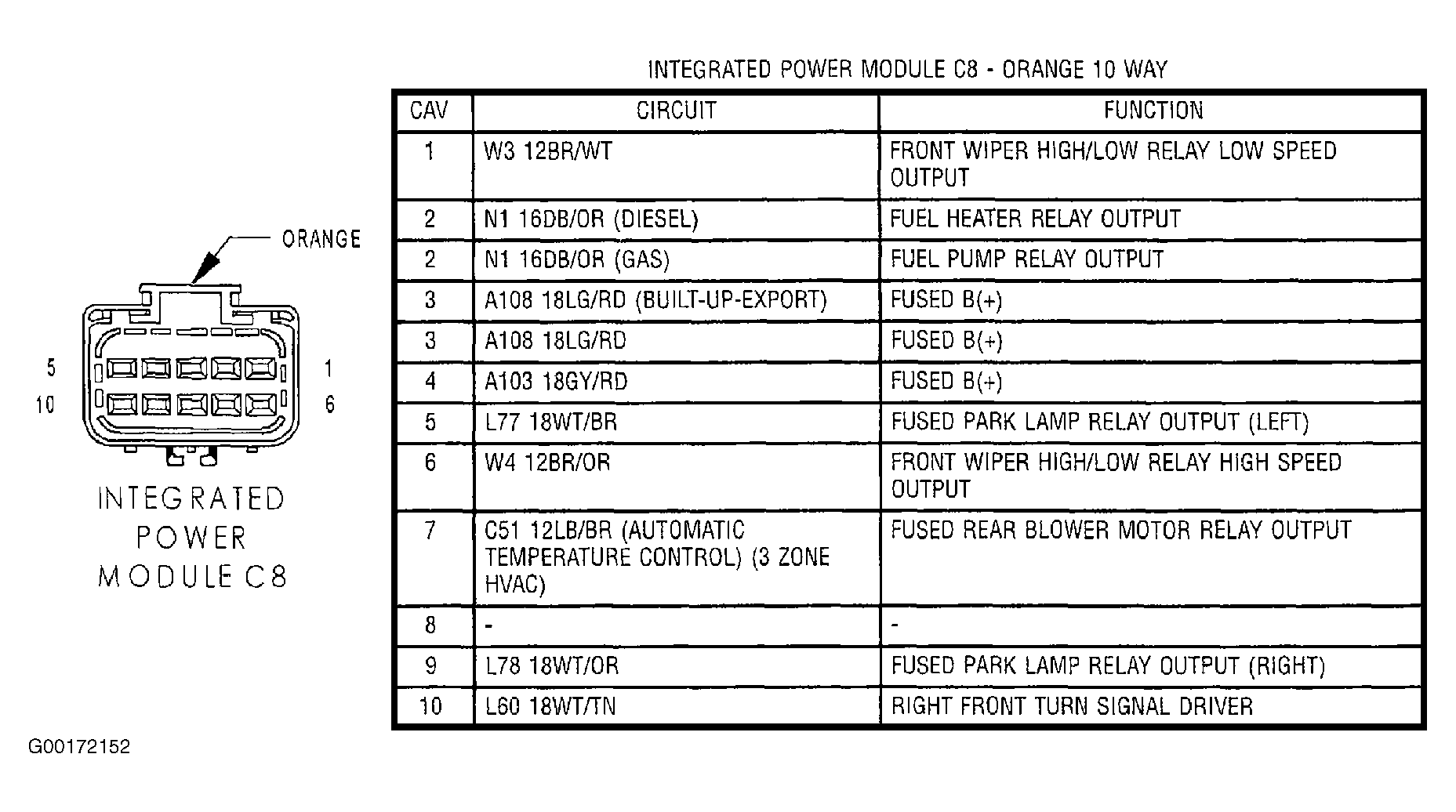 - Turn the ignition off. Disconnect the Body Control Module C2 harness connector. See Figure. Disconnect the IPM C8 harness connector. See Figure. Measure the resistance of the Right Front Turn Signal Driver Circuit and ground. If the resistance is below 5 ohms, replace the Body Control Module. See BODY CONTROL MODULE under REMOVAL & INSTALLATION. If the resistance is above 5 ohms, replace the Intelligent Power Module.
