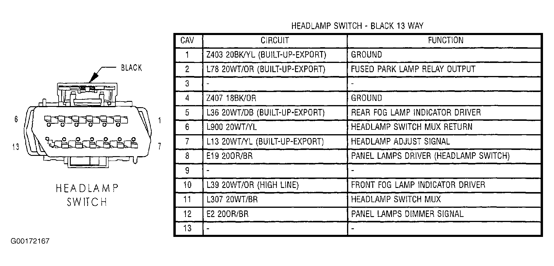 - Turn the ignition off: Disconnect the Headlamp Switch harness connector. See Figure. Measure the resistance of the Panel Lamps Dimmer Signal Circuit and the Headlamp Switch MUX Return Circuit to ground. If the resistance is below 1000 ohms, replace the headlamp switch. See ANALOG INSTRUMENT PANELS article. If the resistance is above 1000 ohms, replace the Body Control Module. See BODY CONTROL MODULE under REMOVAL & INSTALLATION.