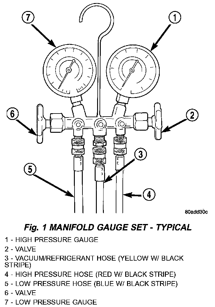 A manifold gauge set may be needed with some recovery/recycling/charging equipment. The service hoses on the gauge set being used should have manual (turn wheel), or automatic back-flow valves at the service port connector ends. This will prevent refrigerant from being released into the atmosphere.