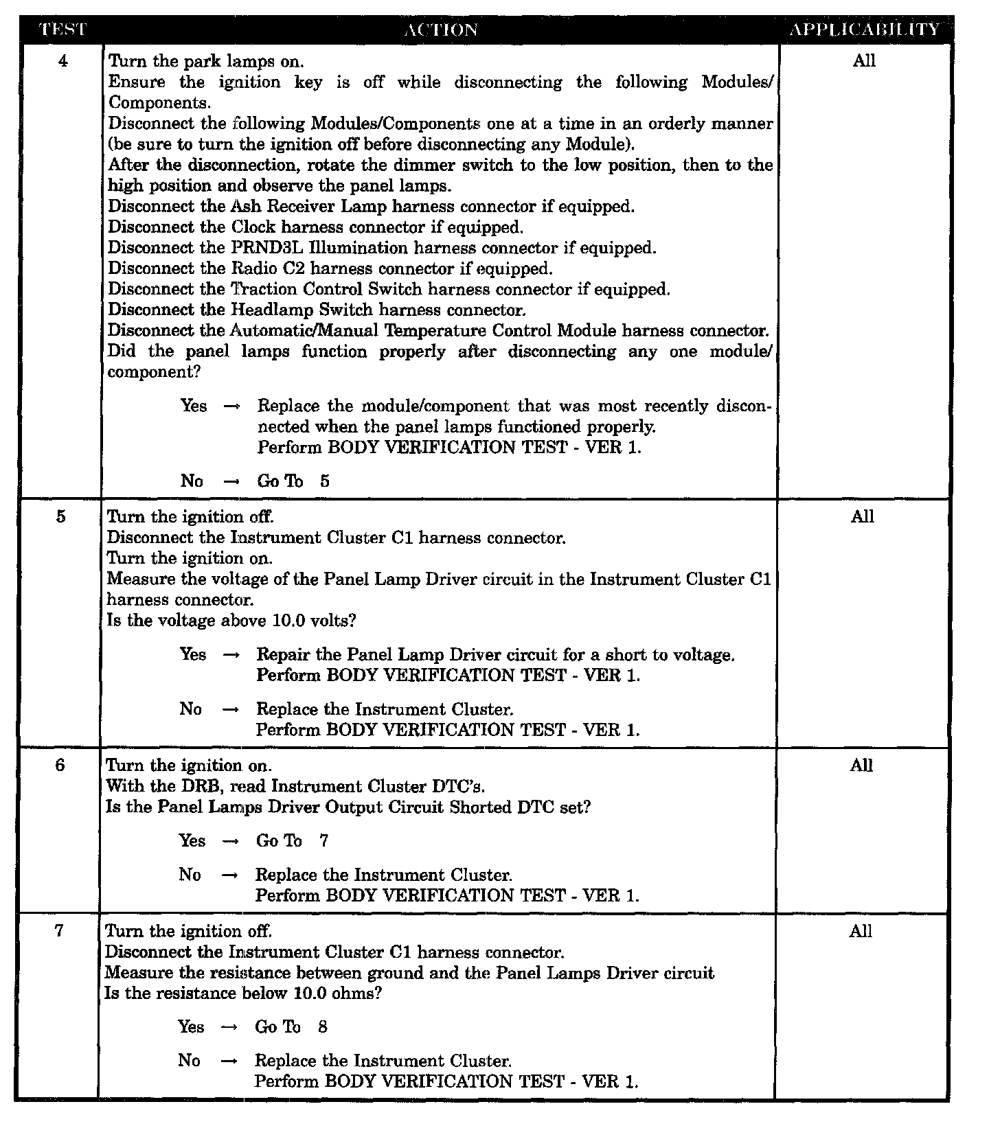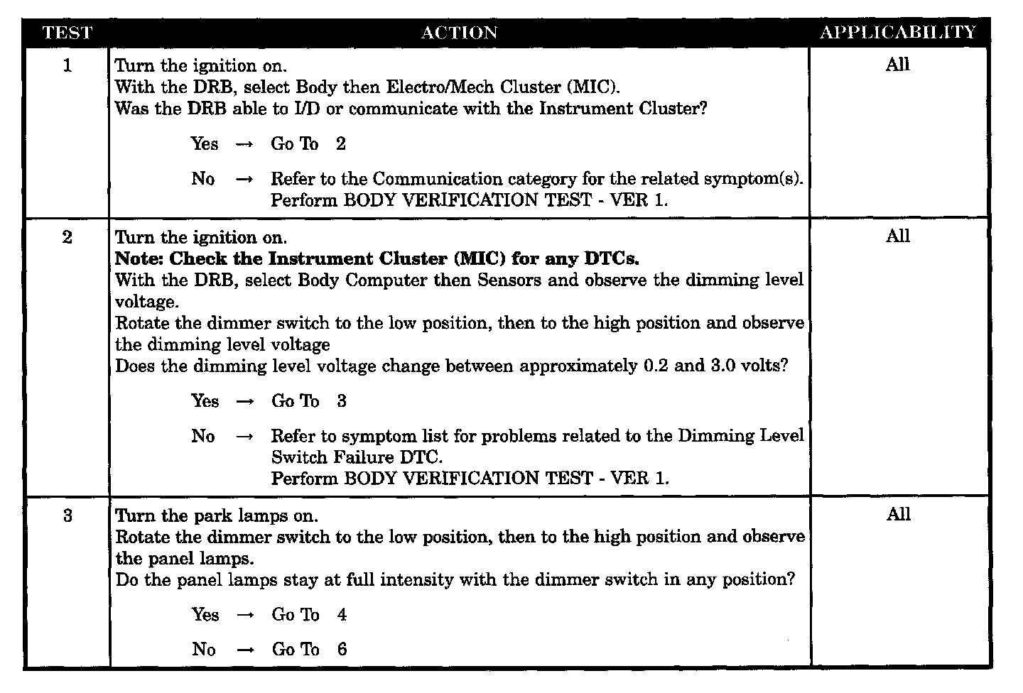 Home >> Chrysler >> 2003 >> Intrepid (CANADA) V6-2.7L >> Repair and Diagnosis >> Powertrain Management >> Computers and Control Systems >> Body Control Module >> Testing and Inspection >> Symptom Related Diagnostic Procedures >> Cluster and Panel Illumination Problems