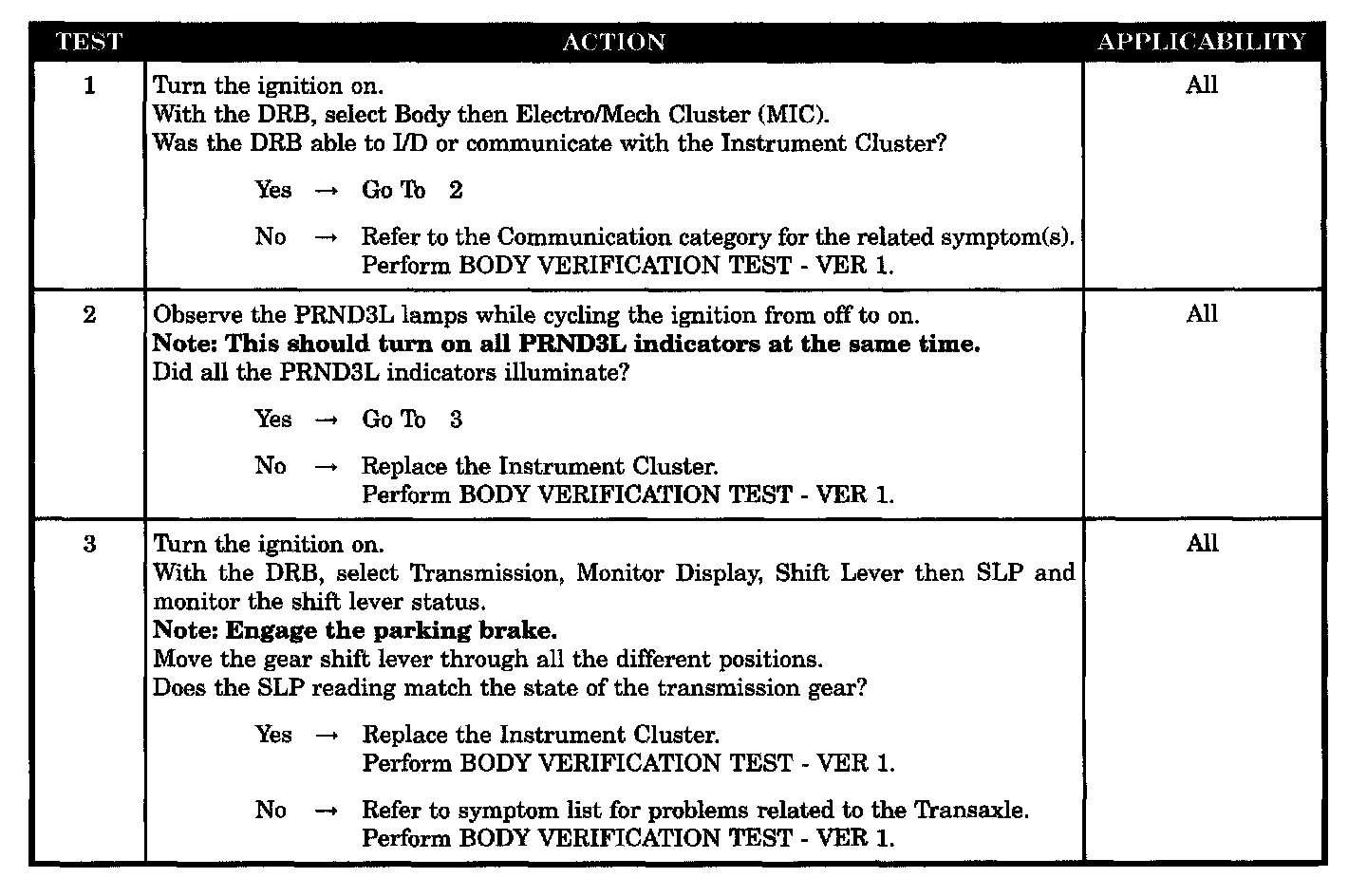 Home >> Chrysler >> 2003 >> Intrepid (CANADA) V6-2.7L >> Repair and Diagnosis >> Powertrain Management >> Computers and Control Systems >> Body Control Module >> Testing and Inspection >> Symptom Related Diagnostic Procedures >> PRND3L Indicator Malfunction